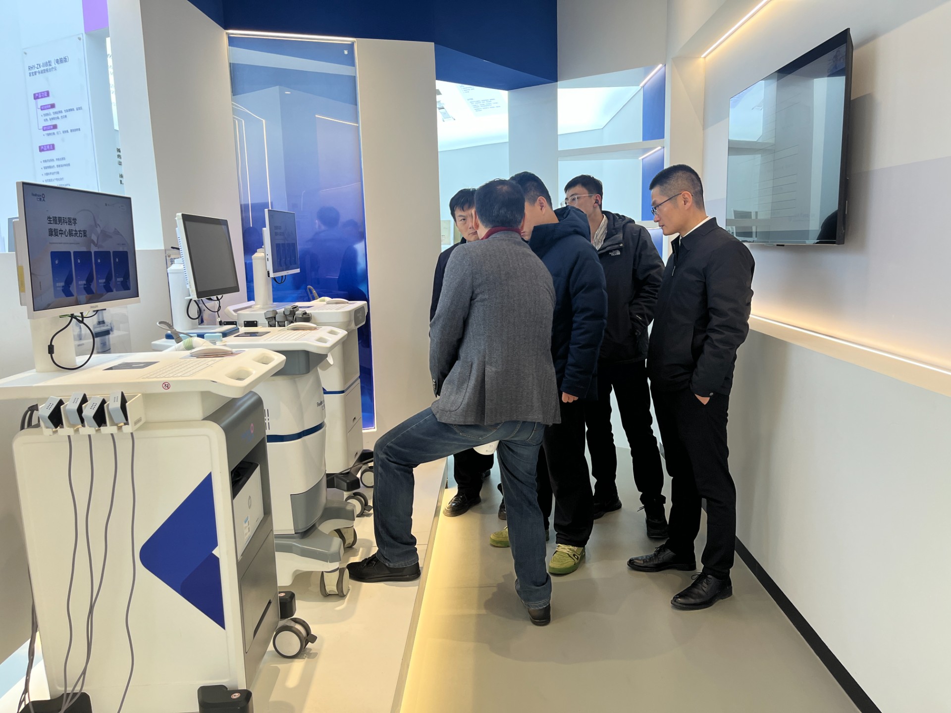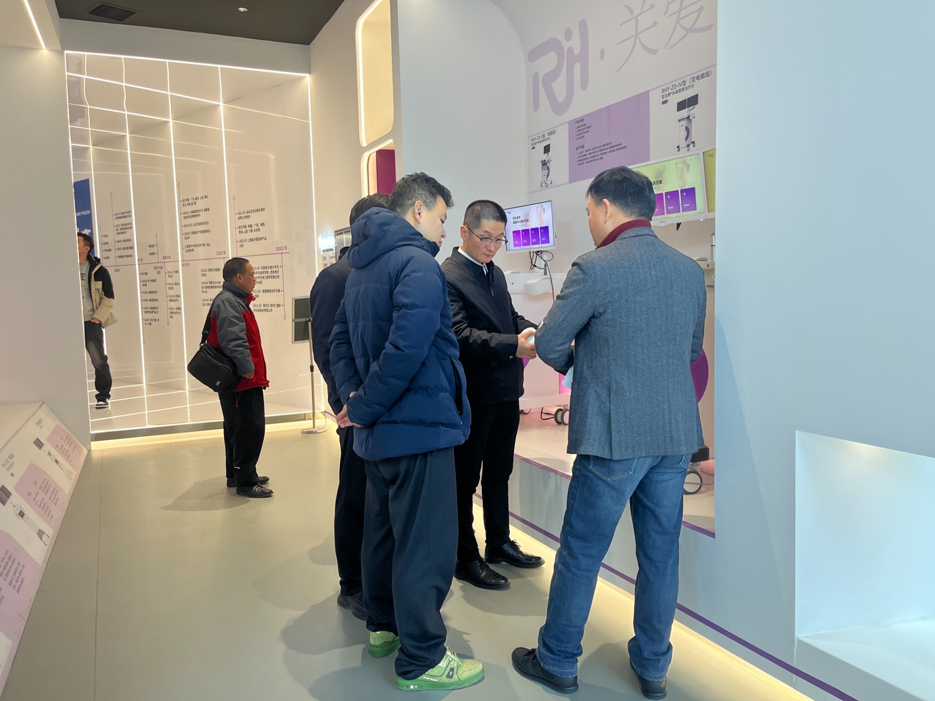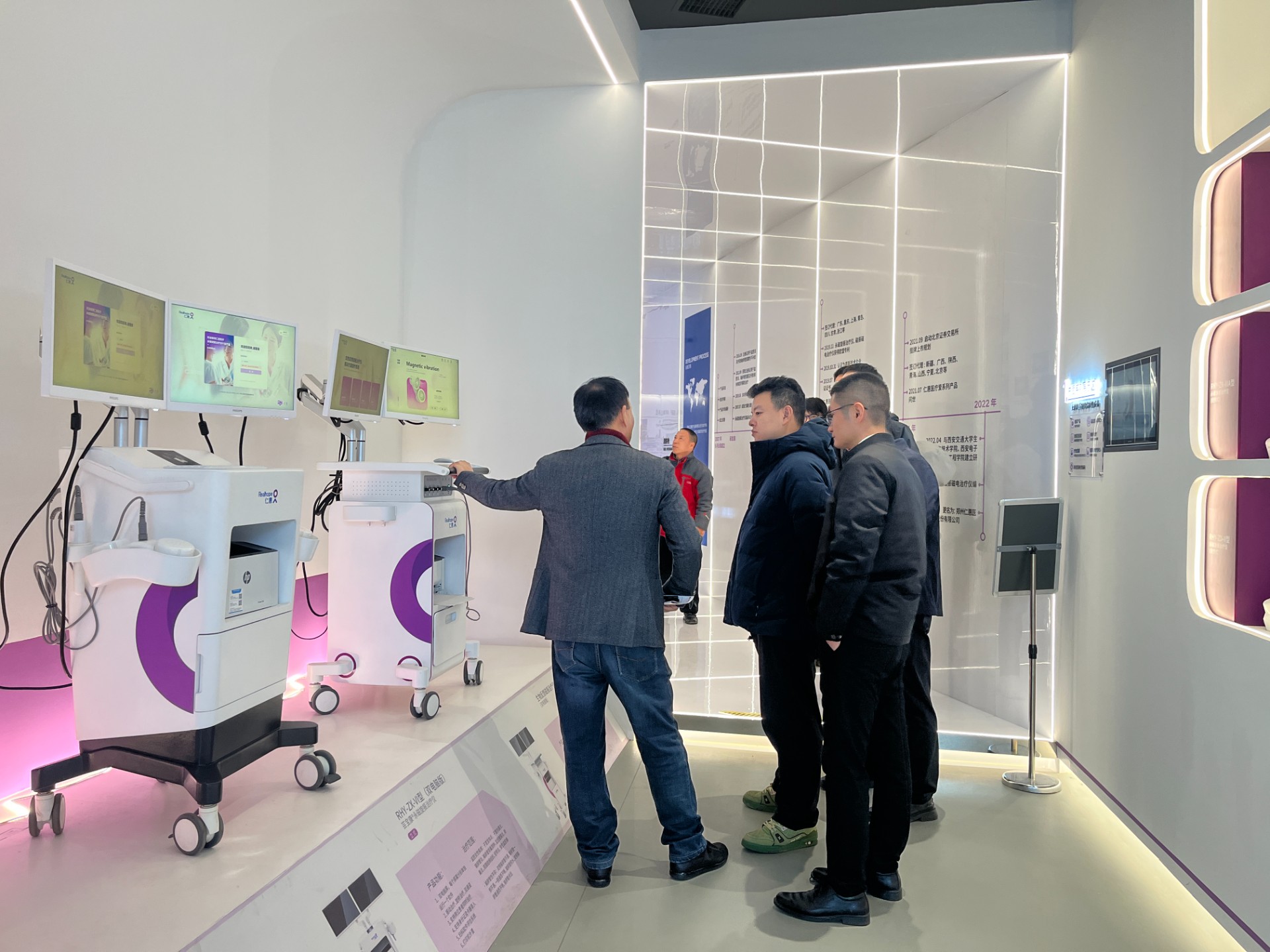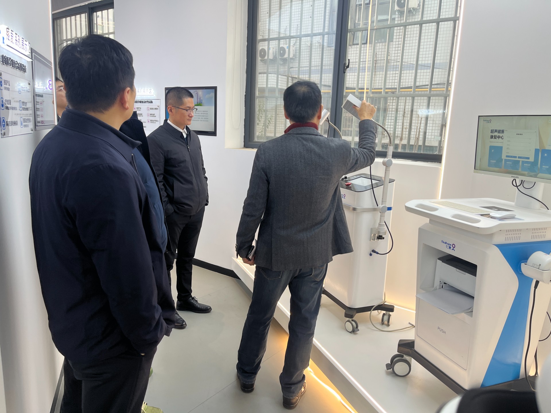 商会代表一行先后走进仁惠医疗展厅,在管世昌董事长的细致讲解下,全面了解企业发展历程、科研布局、核心技术及产品矩阵。从企业发展时间轴到科研单位合作成果墙,商会代表团实地察看、细致问询,深入观摩磁振磁电磁治疗仪等核心产品的功能演示,详细询问技术研发、临床应用、市场推广等情况。
